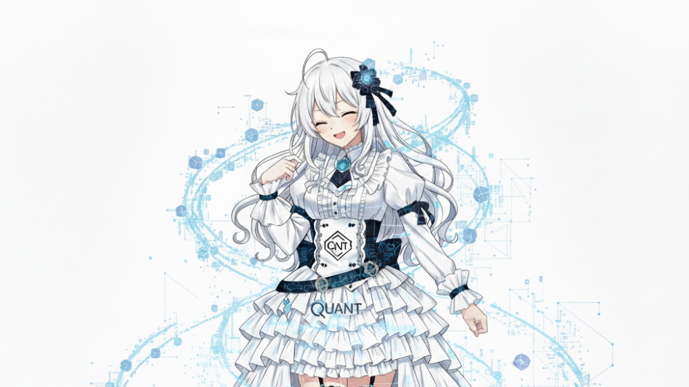 ごきげんよう!わたくし、クアント(Quant/QNT)ですの。ブロックチェーン界の国際文化交流会社の社長……あ、まあ現実のQuant Network社(イギリス)では企業向けにQuantブロックチェーン技術を提供しているんですけれど、社長としてはやっぱり“世界をつなぐ架け橋”のつもりですわ☆