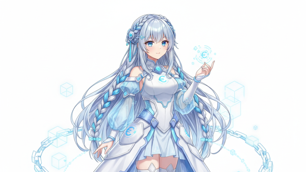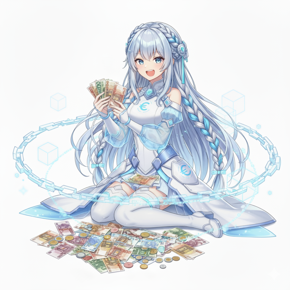 ごきげんよう、わたくしユーロコイン(EURC/EURC)です♡ ブロックチェーン銀行の窓口を担当しているんですけれど、実はお金のことしか考えてません。今日の昼食?ユーロの価値。趣味?利回り計算。恋人?通帳ですわ!……って言ったら上司に“また窓口でボケないでください”って怒られました。